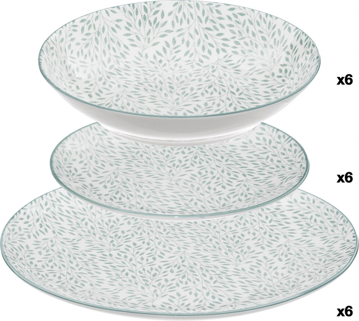 6 persoons wit porseleinen servies met Jasmijnrijst dessin. Door het moderne design is het servies tijdloos maar wel wat anders dan een standaard wit servies. De set bestaat uit 6 diepe borden, 6 grote borden en 6 ontbijtbordjes. Het servies is vaatwasser en magnetron geschikt.