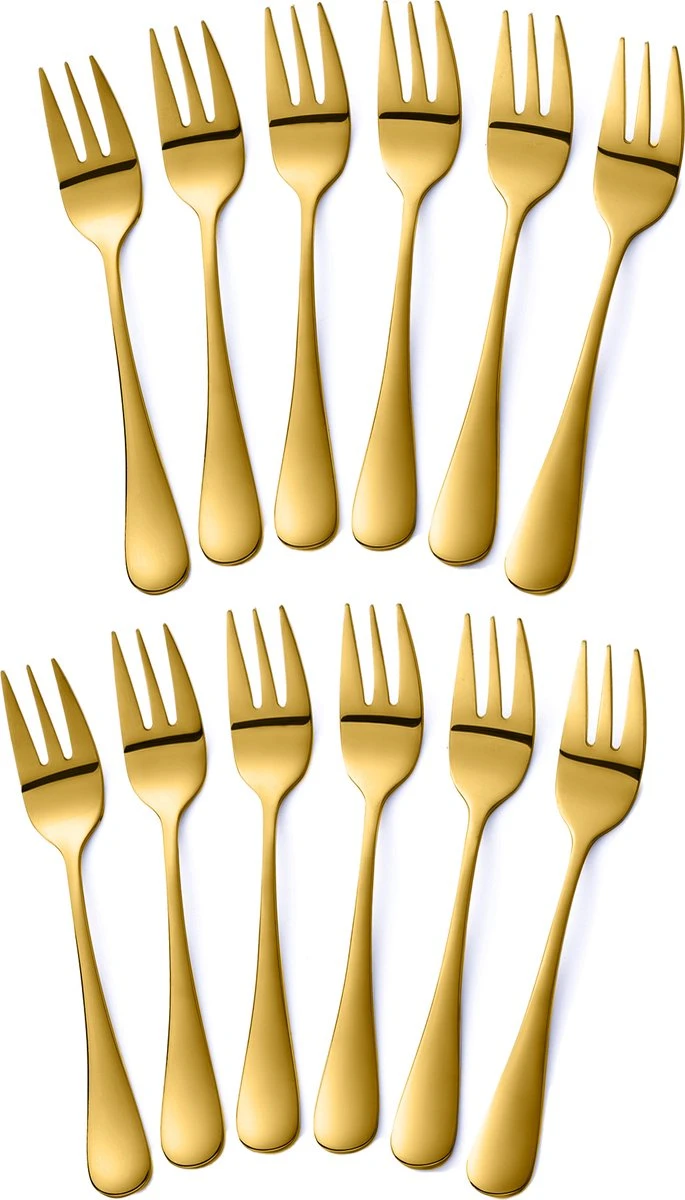 De vorken zijn vervaardigd uit hoogwaardig food grade RVS. Dit zorgt ervoor dat ze jaren meegaan en ze geen metalen bijsmaak met zich meebrengen. De set bestaat uit 12 goudkleurige vorkjes die na gebruik eenvoudig gereingd kunnen worden in je vaatwasmachine.