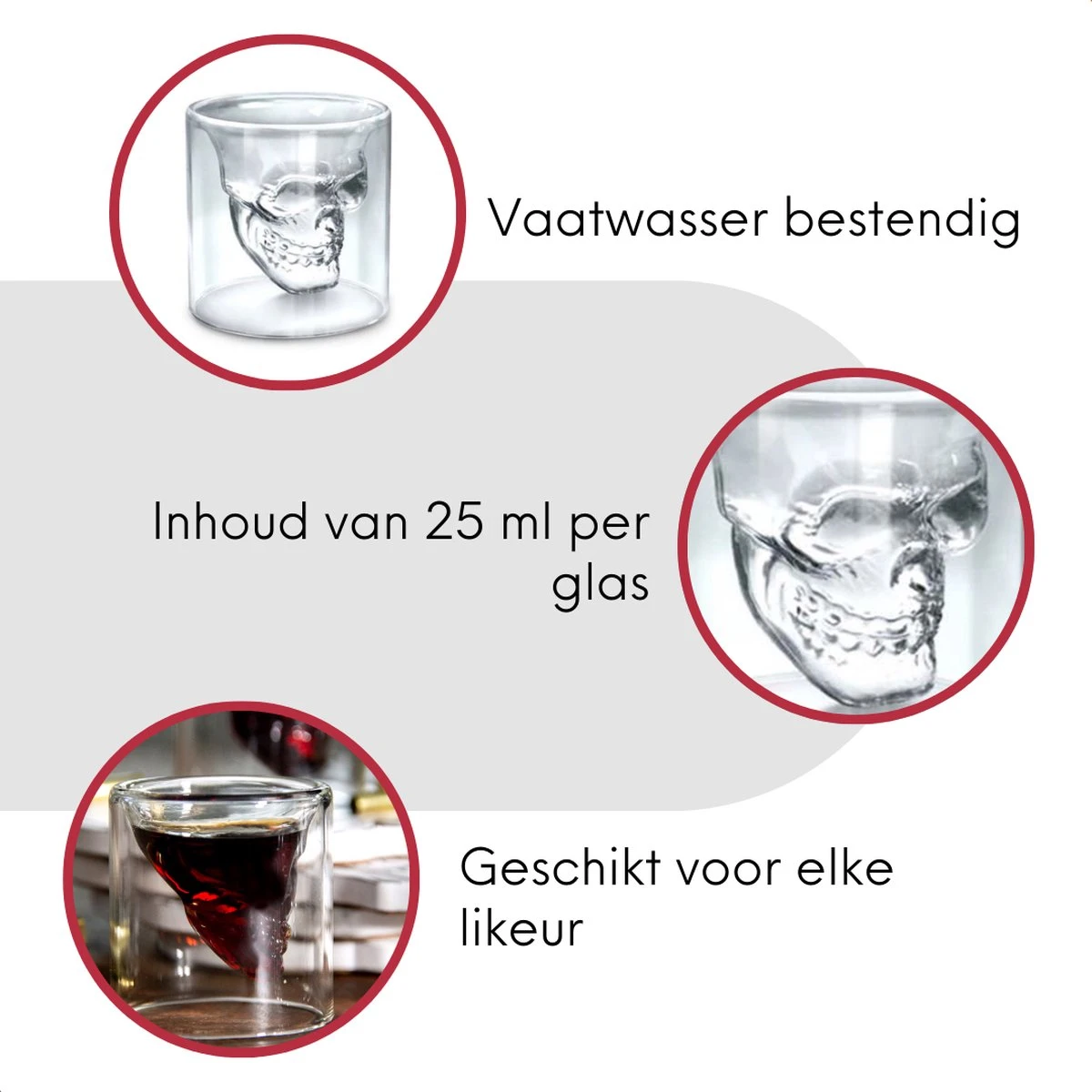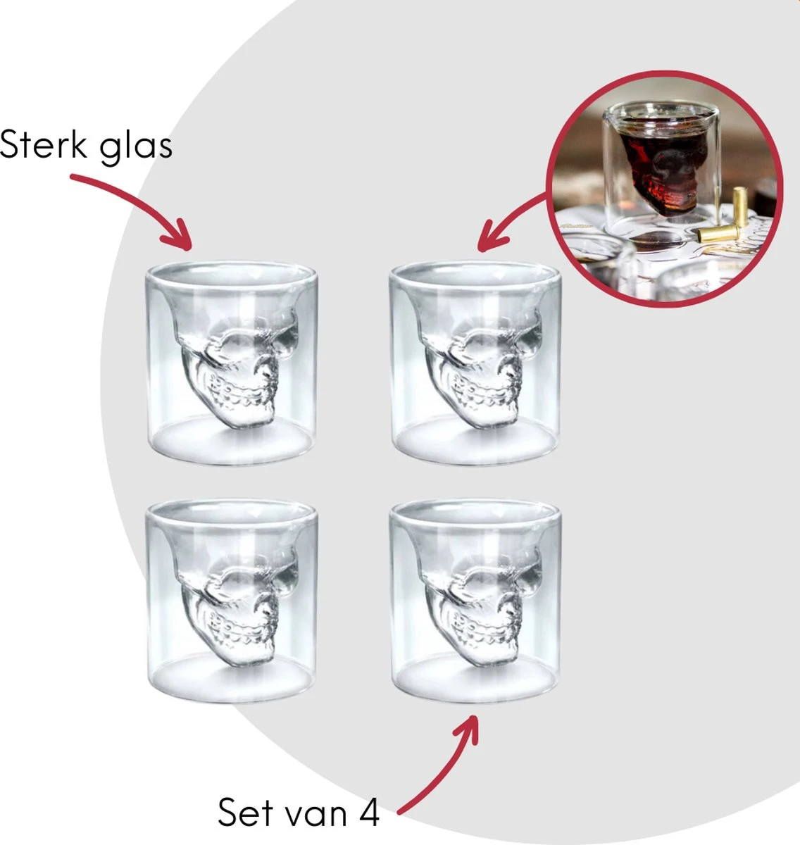 De schedel is gevormd aan de binnenkant van het glas wat een mooi 3D effect geeft. De skull komt voornamelijk tot zijn recht wanneer deze met een donkere drank wordt gevuld. Met deze Aretica skull glazenset zet je in ieder geval iets aparts op tafel. Hoewel de schedel klein lijkt, heeft elk shotglaasje een inhoud van 25 ml.