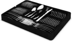Ga je op jezelf wonen en is je uitzet nog niet compleet? Of is je huidige bestek aan vervanging toe? Met deze luxe en zeer uitgebreide bestekset ben je in 1 keer helemaal voorzien. Hij bestaat niet alleen uit bestek voor 12 personen, maar ook handig serveerbestek. Het is gemaakt van edelstaal, een hoge kwaliteit roestvrij staal. Hierdoor ben je ervan verzekerd dat je messen en vorken lang mooi blijven. Het bestek is vaatwasserbestendig dus je kan ze gemakkelijk schoonmaken in de vaatwasser.