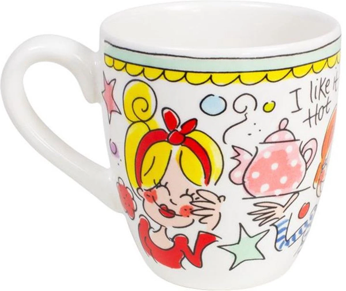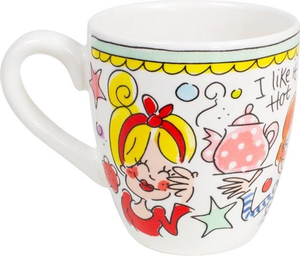 Deze vrolijke Blond Amsterdam mini mok is onderdeel van de welbekende Even Bijkletsen serie en heeft een inhoud van 200 ml. De rand van de mini mok heeft een mint kleur, wat onderdeel is van deze vernieuwde lijn. De mok staat vol met herkenbare en vrolijke illustraties en aan de binnenkant staat een rode ster. De aardewerk mok is perfect voor een heerlijk kopje koffie of thee. Ontdek de rest van het vrolijke Blond Amsterdam servies en alle andere koppen en mokken in onze webshop.