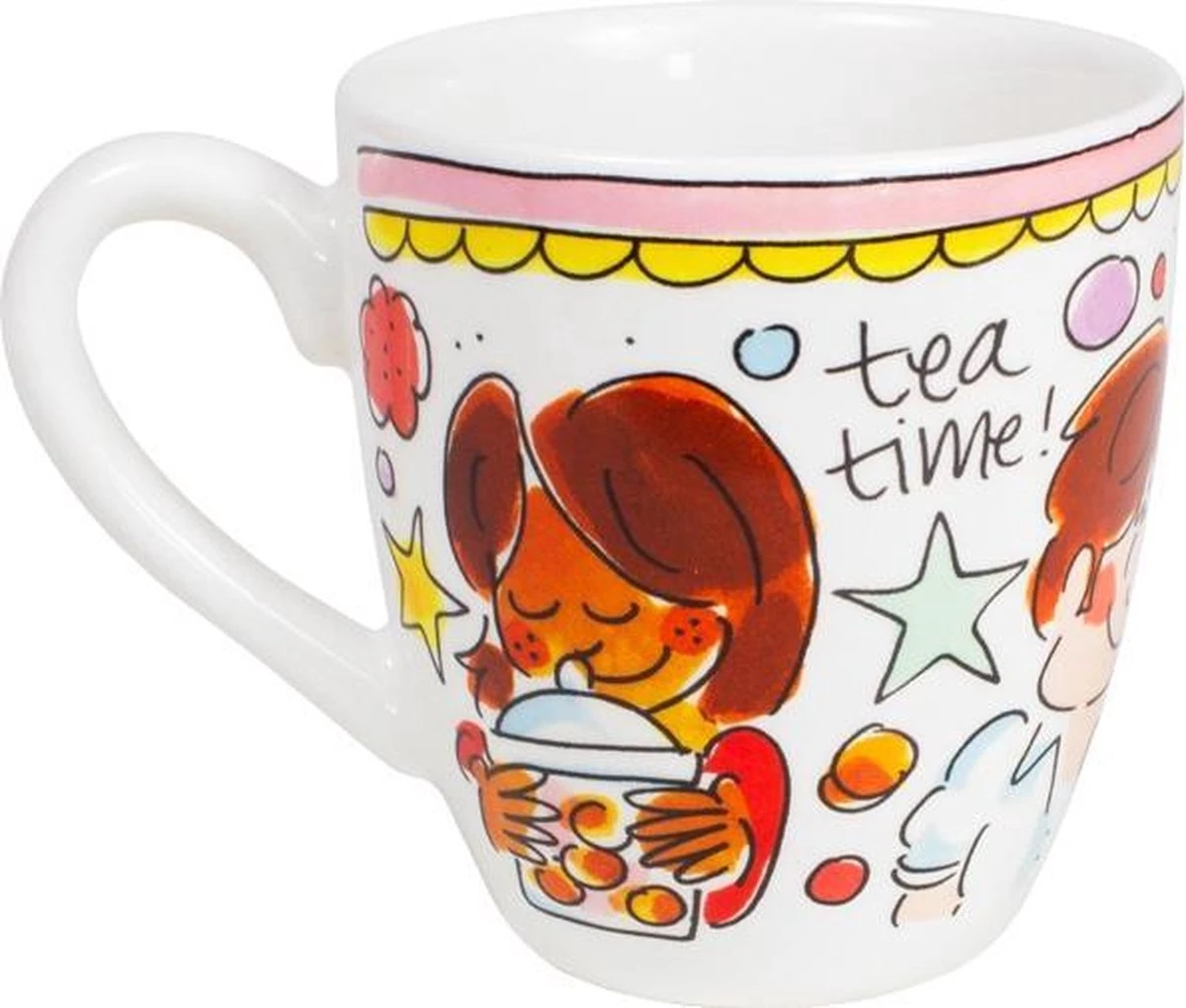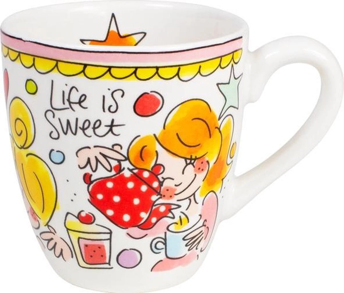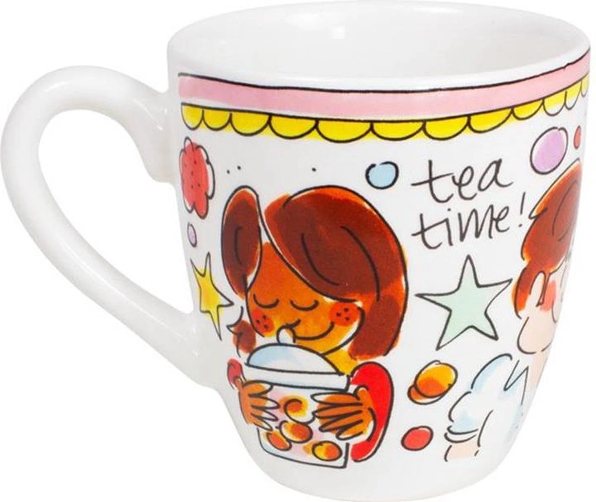 Deze vrolijke Blond Amsterdam mini mok is onderdeel van de welbekende Even Bijkletsen serie en heeft een inhoud van 200 ml. De rand van de mini mok heeft een roze kleur, wat onderdeel is van deze vernieuwde lijn. De mok staat vol met herkenbare en vrolijke illustraties en aan de binnenkant staat een oranje ster. De aardewerk mok is perfect voor een heerlijk kopje koffie of thee. Ontdek de rest van het vrolijke Blond Amsterdam servies en alle andere koppen en mokken in onze webshop.