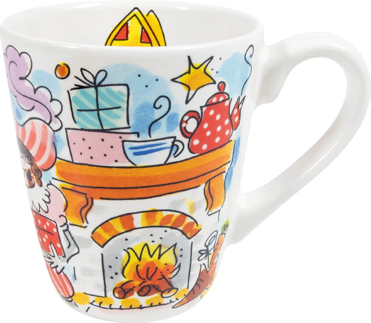 In de Sint collectie van Blond Amsterdam zijn er nieuwe items toegevoegd. Op de beker staan allerlei vrolijke Blond illustraties in het teken van Sinterklaas. Met onder andere: de staf van Sinterklaas, cadeautjes en nog veel meer! In de beker staat een leuke afbeelding met de tekst ‘Welkom Sinterklaasje’. Vul de beker met warme chocomel en slagroom en geniet van het heerlijk avondje.