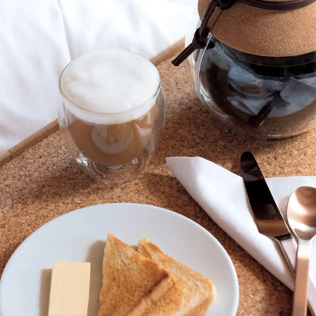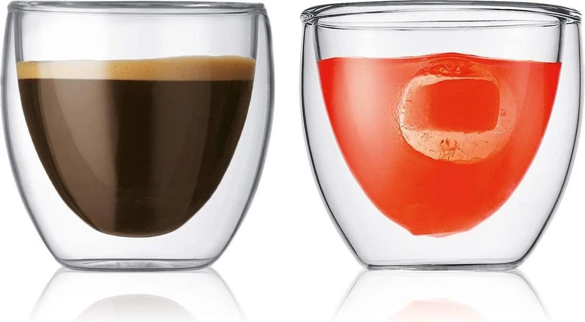 Deze Pavina glazen van Bodum houden koude drank koud en warme drank warm door het duurzame Borosilicate glas. Borosilicaat glas is een sterke hittebestendig glassoort dat veel minder weegt dan normaal glaswerk, daardoor blijft het glas licht en extra sterk. Dankzij de dubbele wand blijven de mokken koel aan de buitenkant wanneer er een warme drank in geserveerd wordt. Deze glazen hebben een inhoud van 80 ml en mogen in de microgolfoven en afwasmachine. De set bestaat uit 6 stuks van de serie Carte Noire.