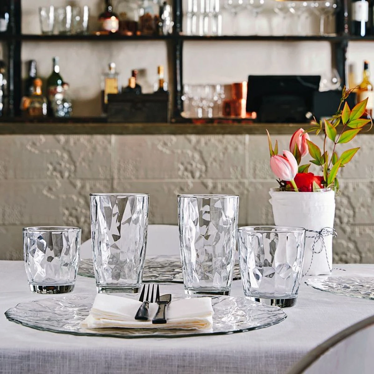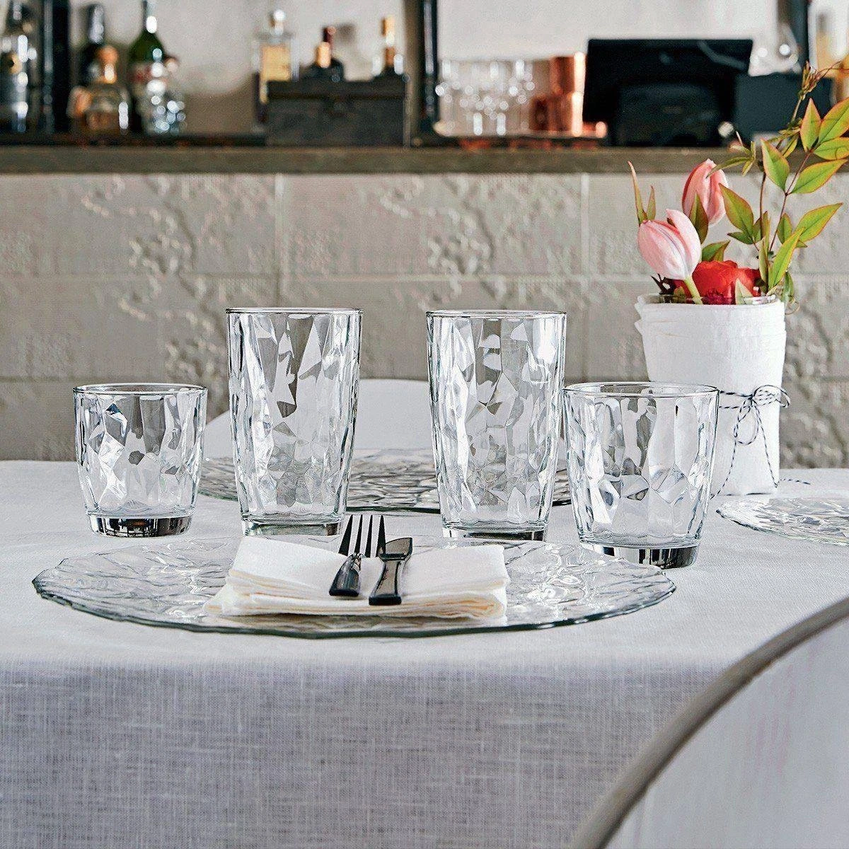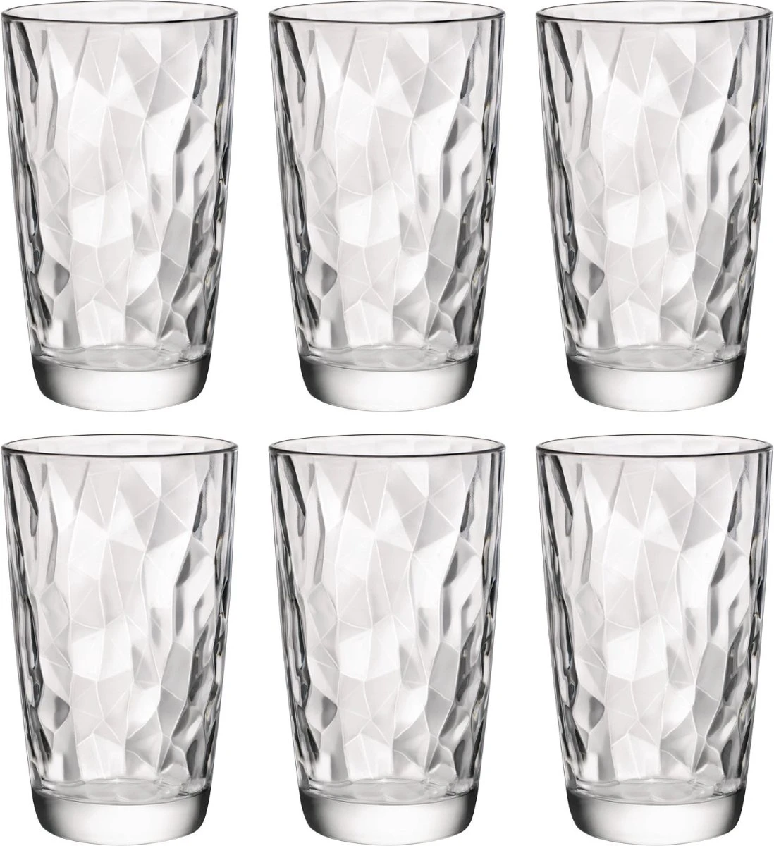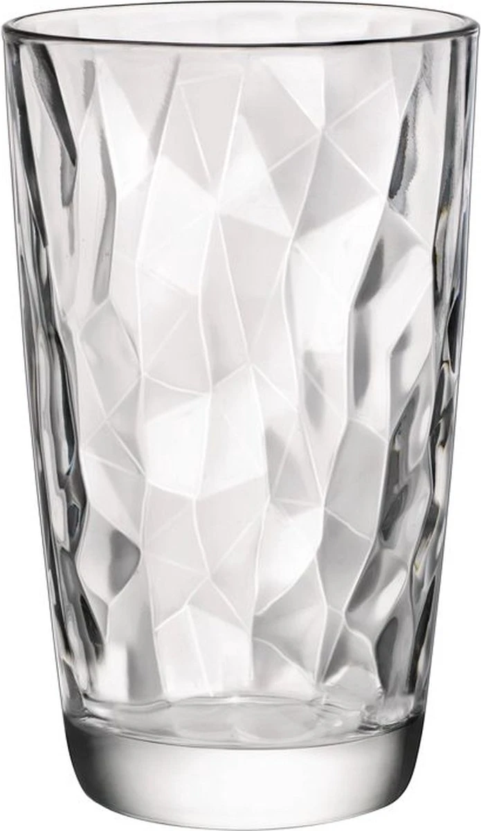 Het Bormioli Diamond glas zorgt door zijn gebroken patroon voor een stijlvolle dinertafel. Dit glas is met een inhoud van 47 centiliter perfect voor meerdere dranken zoals water, frisdranken en vruchtensappen.
