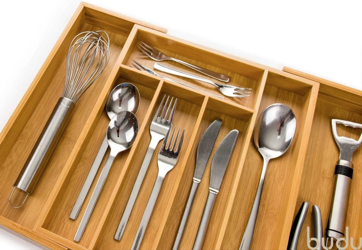 De Budu Bestekbak geeft uw besteklade een opgeruimde en luxe uitstraling. De bestekbak is gemaakt van 100% duurzaam bamboe. Bamboe is een zeer sterk en slijtvast materiaal. De bestekbak past in vrijwel elke lade, omdat hij in de breedte uitschuifbaar is. De bestekbak beschikt over maximaal 7 compartimenten, hierdoor kunt u al uw keukengerei netjes opbergen. De bestekbak is ook te gebruiken als organizer voor andere producten, zoals kantoorartikelen, gereedschap of make-up.