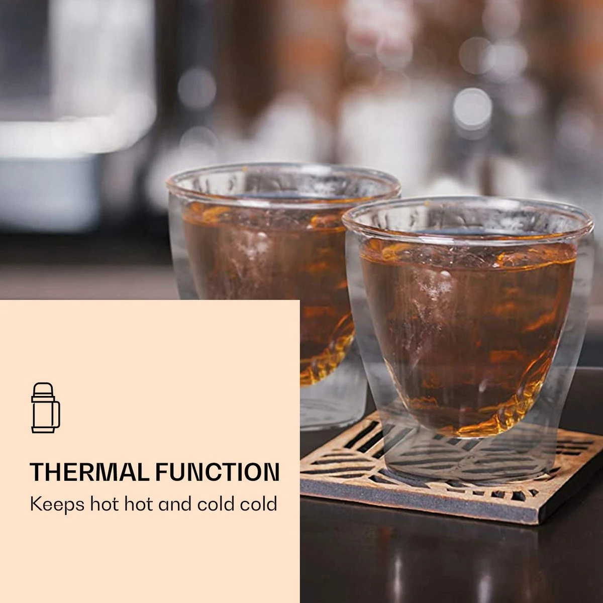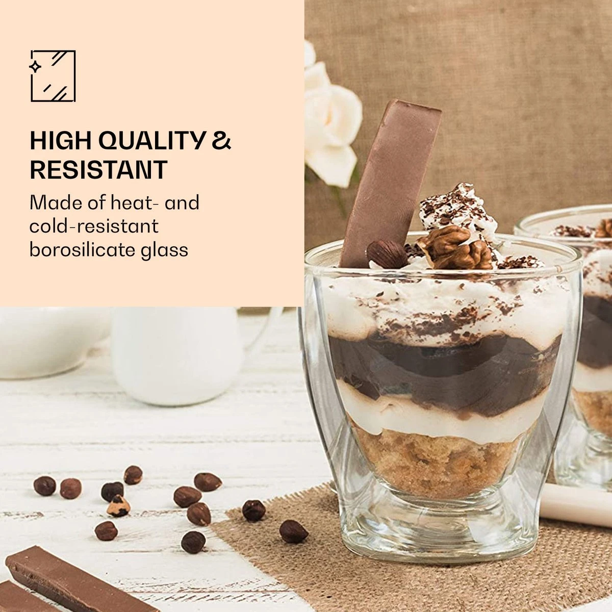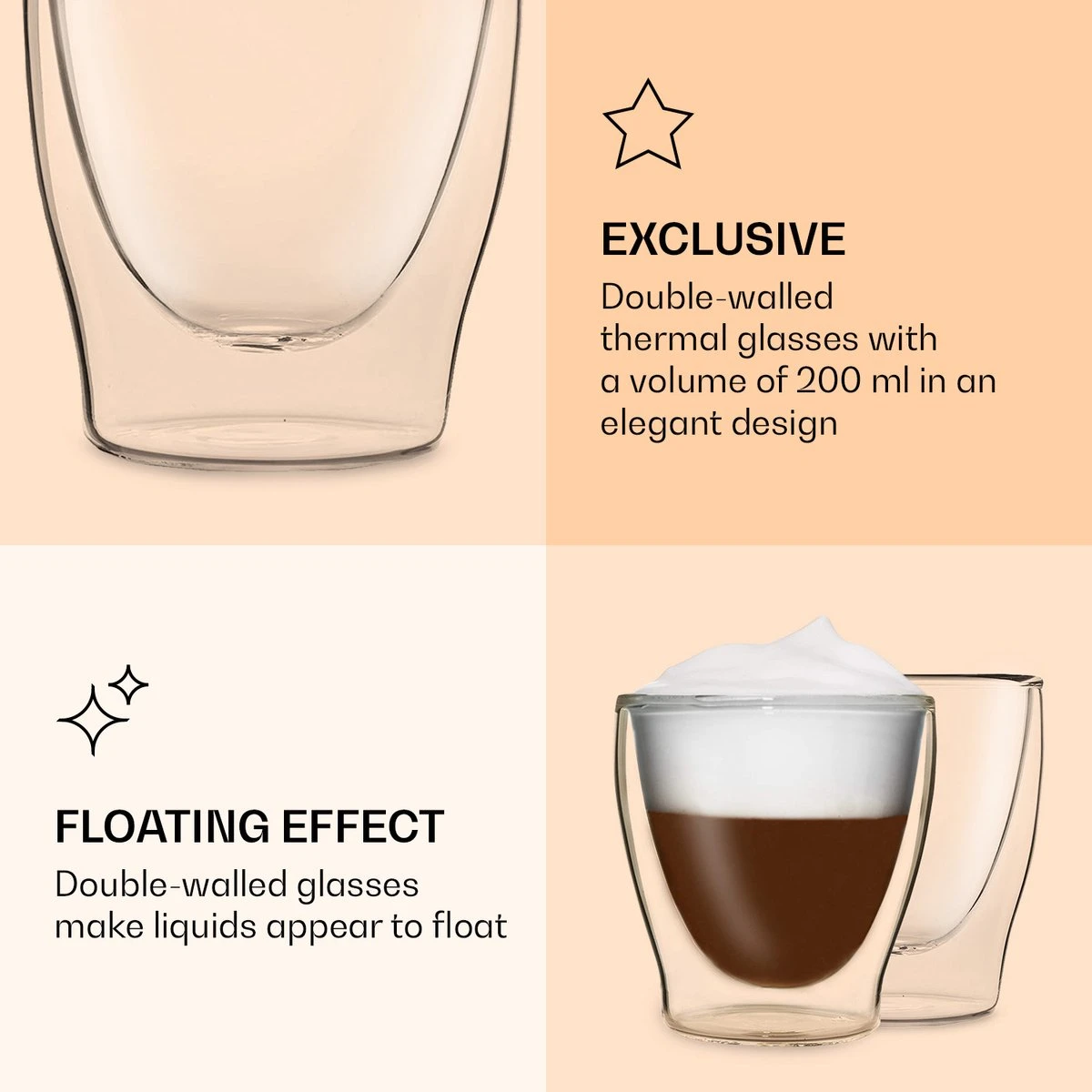 Het edele DUOS drinkglas van Feelino by Klarstein is handgemaakt en verrijkt je woonambiance met zijn elegante design. De dubbelwandige laag houdt koude dranken langer koud en warme dranken langer warm. Deze aantrekkelijke beker van borosilicaatglas voor espresso, thee, shots, aperitief of desserts is bijzonder resistent en hittebestendig: Hij is krasbestendig, heel licht en natuurlijk ook geschikt voor de vaatwasser. Het dubbelwandige systeem zorgt daarnaast voor een verbazingwekkend optisch effect, waardoor de vloeistoffen lijken te zweven. Stijlvol, robuust en met de hand gemaakt – de dubbelwandige DUOS Jumbo thermosglazen van Feelino by Klarstein.