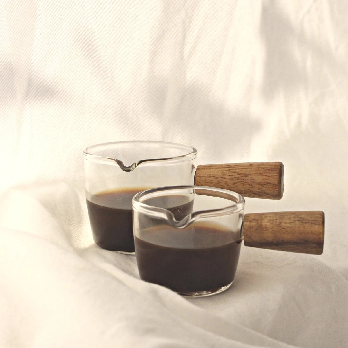 Wil jij je eigen favoriete barista en verdien jij het lekkerste kopje speciale koffie? Onze House of Husk Espresso maat beker set help jou hiermee. Onze set bestaat uit 2 shotglazen voorzien van een houten handvat of de vingers te beschermen tegen het hete glas. De set bevat een 50 ml en 100 ml glas, perfect voor de inhoud van een enkele en dubble espresso. Naast het houten handvat, is het glas extra dik gesmeed en voorzien van een praktisch schenktuitje, zodat jij zonder morsen de lekkerste koffie maakt.
