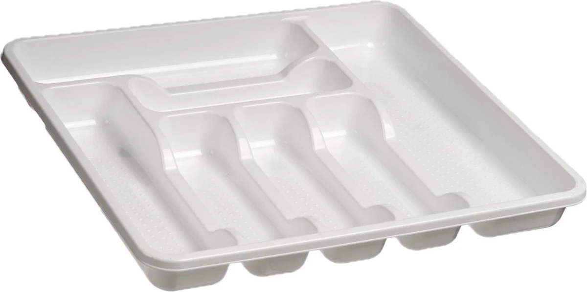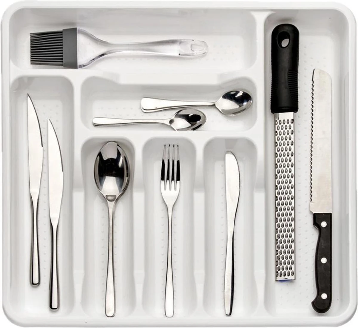 Bestekbak/bestekhouder 7-vaks wit. Formaat: 42 x 39 x 4,5 cm. Materiaal: kunststof. Keukenlade/besteklade inzetbak.