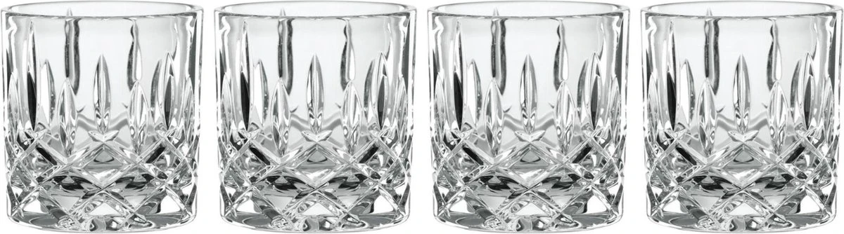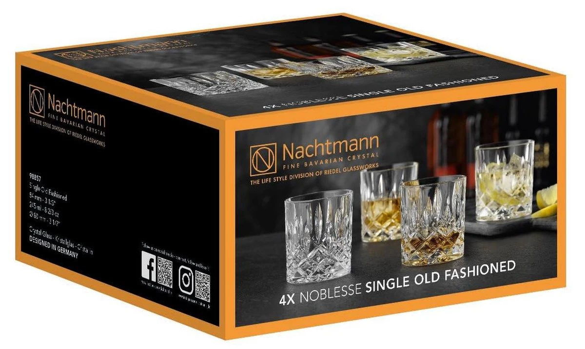 Dit single old fashioned glas uit de serie ‘Noblesse’ van Nachtmann is perfect voor whisky en old fashioned. Dit bijzonder luxe, prachtig geslepen glas trekt alle aandacht naar de voet. Hier zie je een helder ruitvormig patroon dat verder naar boven overgaat in langwerpige figuren. Eenmaal gevuld staat er pure luxe bij jou op tafel. Deze set bevat 4 single old fashioned glazen, ieder met een inhoud van 245 milliliter.