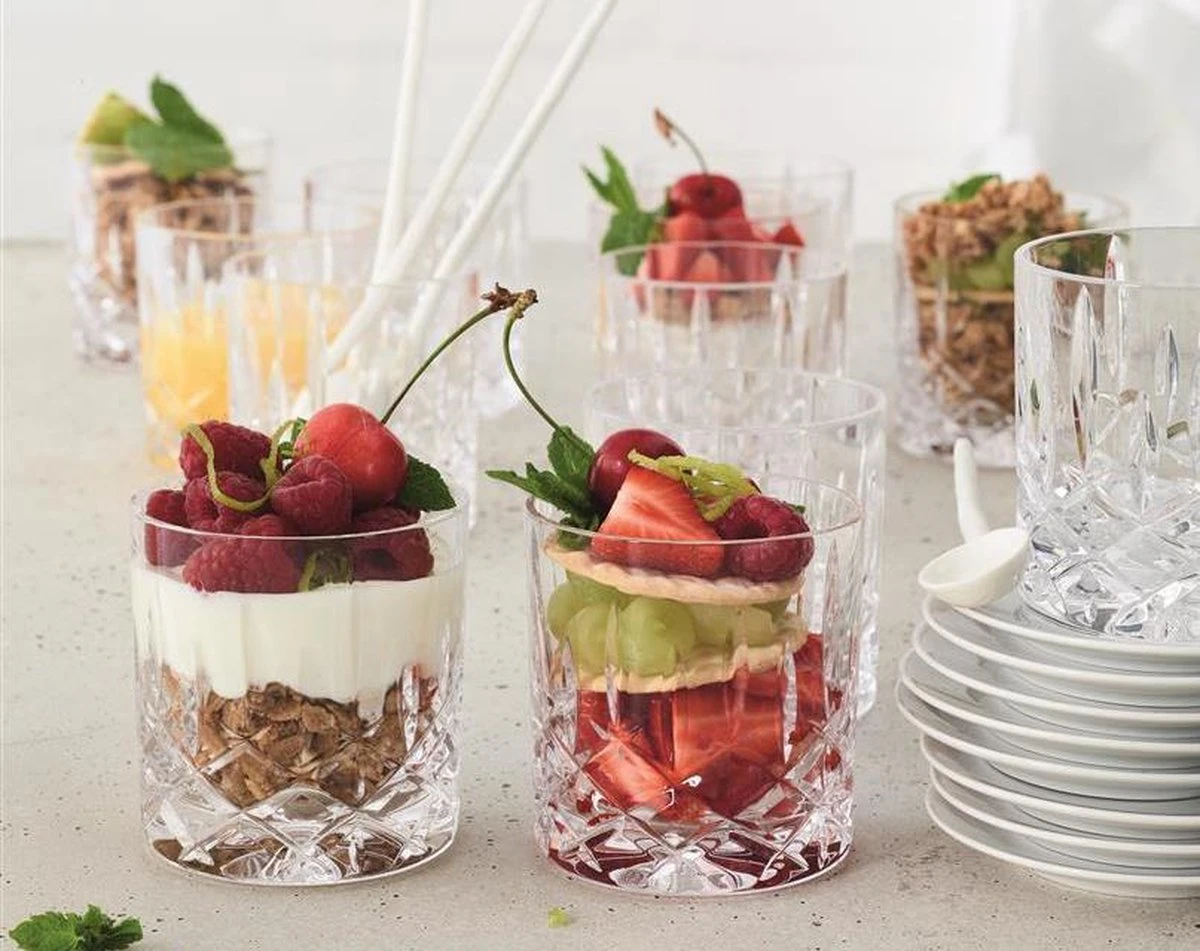 Het ‘Noblesse’ glaswerk van Nachtmann wordt gemaakt in Duitsland uit kraakhelder kristalglas. De glazen en schalen zijn schitterend geslepen met fijne details en een prachtige lichtbreking. Dankzij de hardheid van het kristalglas is het glaswerk duurzaam, zeer krasbestendig en behoudt het haar glans. En, handig, alle artikelen en items mogen gewoon in de vaatwasmachine.