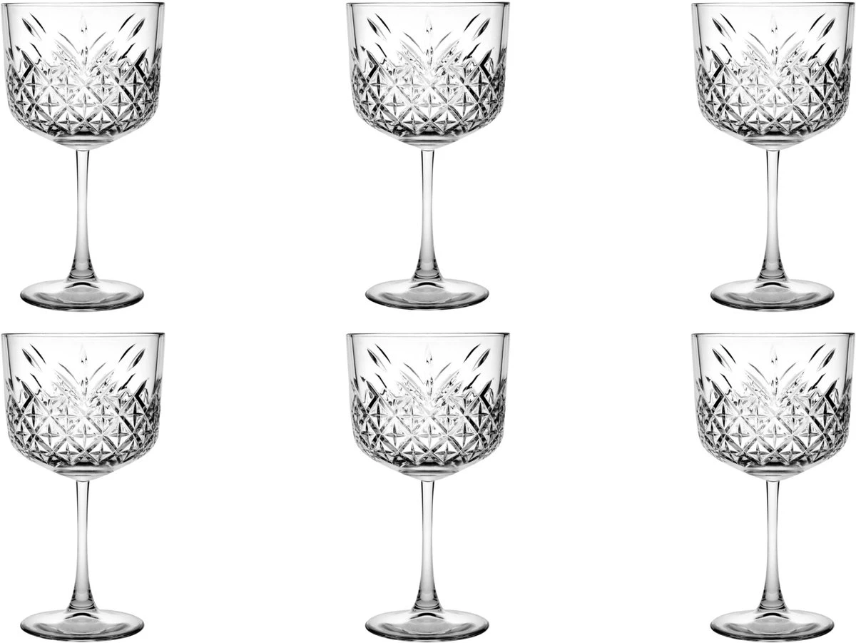 Deze prachtige Timeless gin tonicglazen zijn zeer geschikt voor het schenken van diverse soorten gin tonics. Maar ook andere cocktails zullen perfect staan in deze glazen. Deze glazen maken met hun opvallende gehoekte glasbewerking en hoge vrouwelijke steel iedere drank bijzonder. Deze elegante glazen zijn gemaakt van extreem sterk glas en zijn perfect voor een feestje en dagelijks gebruik. En na gebruik kunnen deze glazen gereinigd worden in de vaatwasmachine. Deze set bestaat uit 6 gin tonicglazen met een inhoudsmaat van 55 cl.