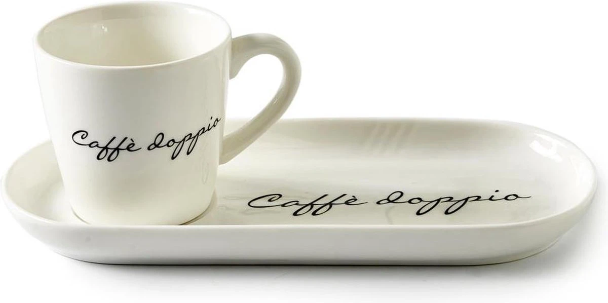 De Caffè Solo en Caffè Doppio in fris wit zijn geschikt voor espresso, dubbele espresso, cappuccino maar ook voor normale koffie. Mits met de grootste aandacht bereid zoals de echte Italianen het doen. Op het bijpassende blaadje is ruimte voor een zoete lekkernij.