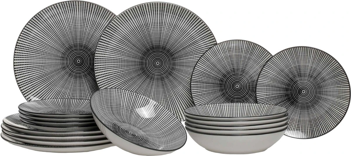 Serviesset In-Line 18-DeligBreng een extra uitstraling aan je eettafel met deze leuke In-Line Serviesset. Het servies is gemaakt van aardewerk en kan gereinigd worden in de vaatwasser. De set is geschikt voor 6 personen en bestaat uit: 6 dinerborden Ø 27 cm 6 ontbijtborden Ø 20.5 cm 6 diepe borden Ø 19.5 cm