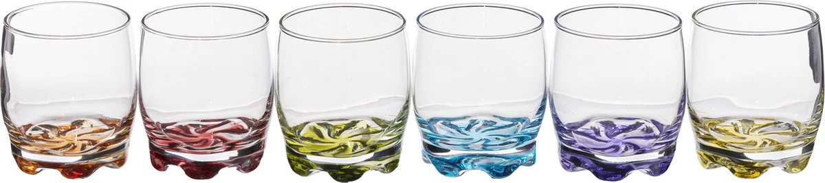 Set van 6x stuks kleurrijke drinkglazen/waterglazen. Deze drinkglazen zijn perfect om uw heerlijke drank naar keuze op te drinken, daarnaast heeft elk glas een eigen kleur die een uniek karakter geeft aan de bodem van elk glas. Inhoud per glas: 310 ml Diameter 7 cm Hoogte: 9 cm Kleur: divers Materiaal: glas.